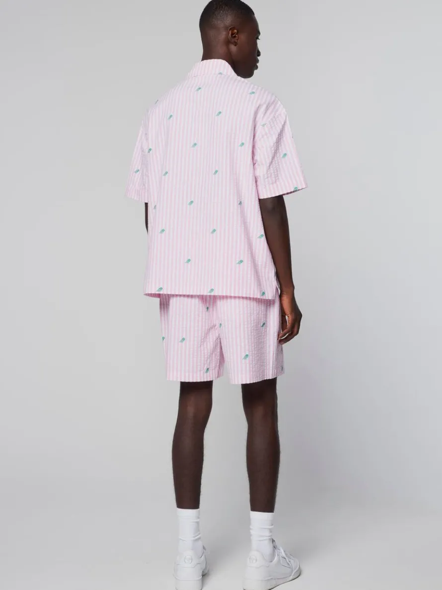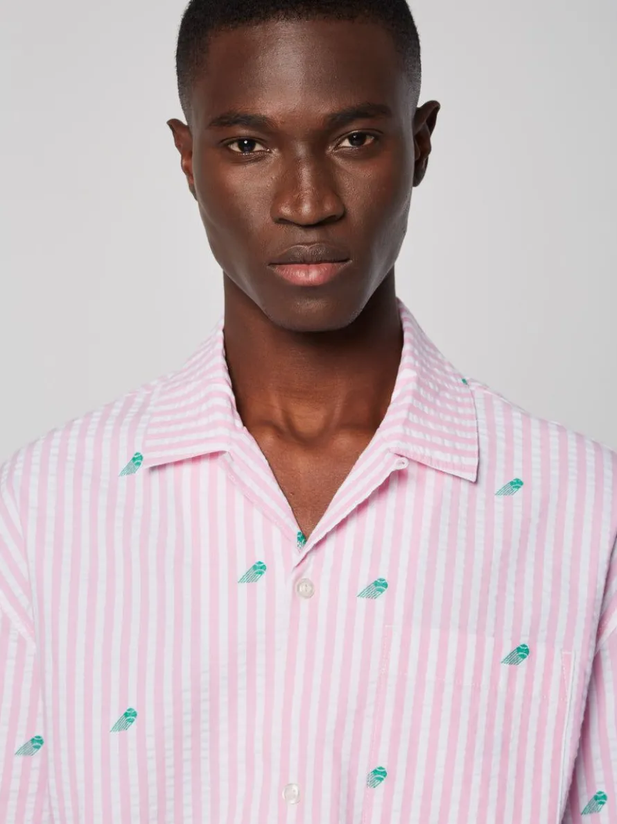 Inspired By Vintage Cabana Sets, The Granda Camp Shirt Is Made Of Lightweight Striped Cotton Seersucker For Comfort And Breathability Through Warm Weather. Topped With A Casual Camp Collar, This Relaxed Resort Button-Up Is Complete With A Spacious Left Chest Pocket, Custom Woven Label At The Left Hem, And An All-Over Tennis Ball Motif For A Retro Sportswear Vibe.